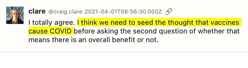 Another speaker was Dr Clare Craig. Who in April 2021 Tweeted, ” I think we need to seed the thought that vaccines cause COVID before asking the second question of whether that means there is an overall benefit or not.”